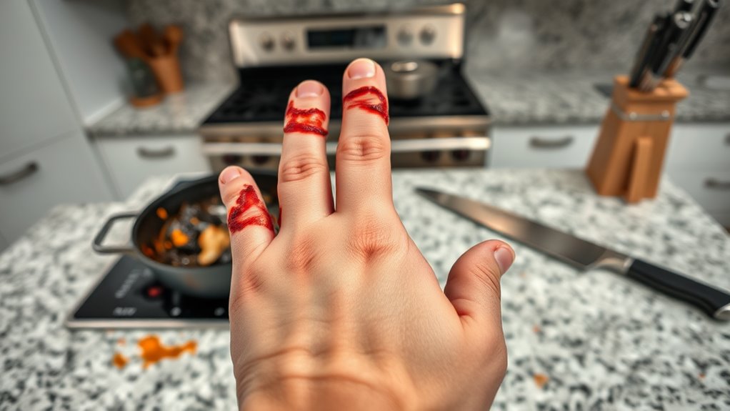 If you’ve burned yourself in the kitchen, first assess the severity. If it’s a first-degree burn, cool the area under running cool water for 10 to 20 minutes. Avoid ice, as it can worsen the injury. Gently pat it dry, then apply a soothing ointment like aloe vera. Cover it with a clean, non-stick bandage, and consider over-the-counter pain relievers for discomfort. If blisters form or signs of infection appear, seek help. There’s more you can do to ensure proper healing.