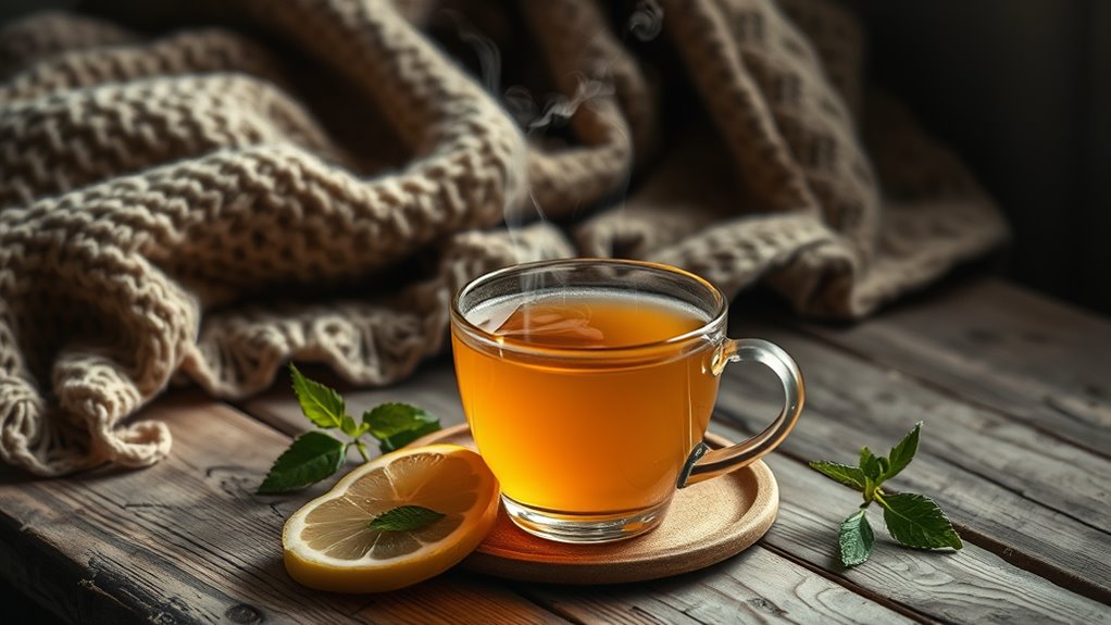 If your cold won’t go away, try a soothing herbal tea made with ginger, lemon, and honey. Ginger reduces inflammation and helps soothe your throat, while lemon packs in vitamin C to boost your immunity. Honey adds antimicrobial benefits and eases coughs. Just boil water, steep your ingredients, and enjoy warm for relief. This simple tea can help you feel better, and there are more ways you can support your recovery that you might find helpful.