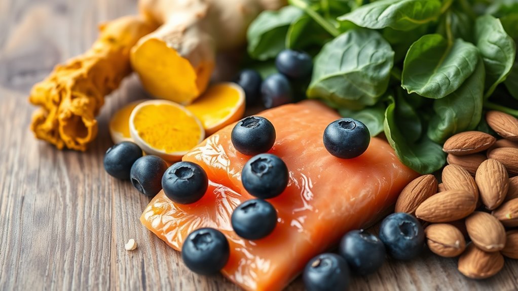 You can fight chronic inflammation by adding these six foods to your diet: turmeric, with its curcumin to reduce swelling; fatty fish like salmon for omega-3s that lower inflammatory markers; berries packed with antioxidants; leafy greens rich in vitamins for gut health; nuts and seeds for healthy fats; and olive oil to protect your heart. Incorporating them daily boosts your wellness, and you’ll uncover more practical tips just ahead.