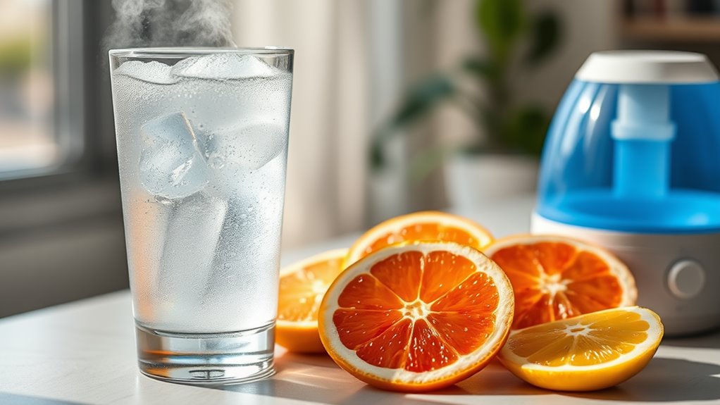 Say goodbye to dry mouth by staying hydrated—sip water throughout the day and avoid caffeine or alcohol. Chew sugar-free gum to boost saliva, and try lozenges for extra relief. Use a humidifier at night and eat hydrating foods like fruits and veggies. Keep up good oral hygiene with regular brushing and flossing. Uncover additional strategies to maintain that fresh, moist feel.