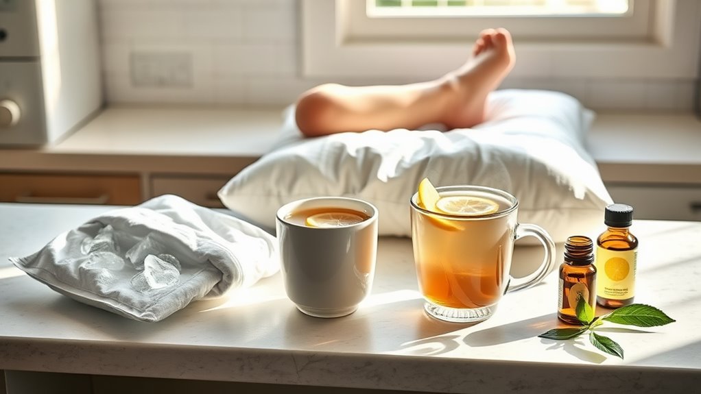 While elevation helps reduce swelling, you’ll find herbal remedies offer a natural complement by harnessing plants’ anti-inflammatory compounds. Additionally, Boswellia is another potent herb that blocks inflammatory pathways to further support inflammation management.
