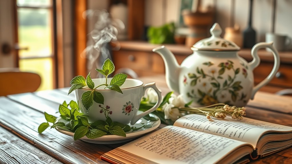 For maximum extraction, steep your herbs in hot water—ideally around 200°F—for at least 5-10 minutes. Consider using a teapot with a lid to trap essential oils. If you’re blending herbs, balance their strengths for a harmonious flavor. Finally, avoid adding excessive sweeteners or additives that could mask the tea’s natural goodness. Additionally, consider incorporating soothing herbal teas like peppermint or ginger to enhance digestive comfort.